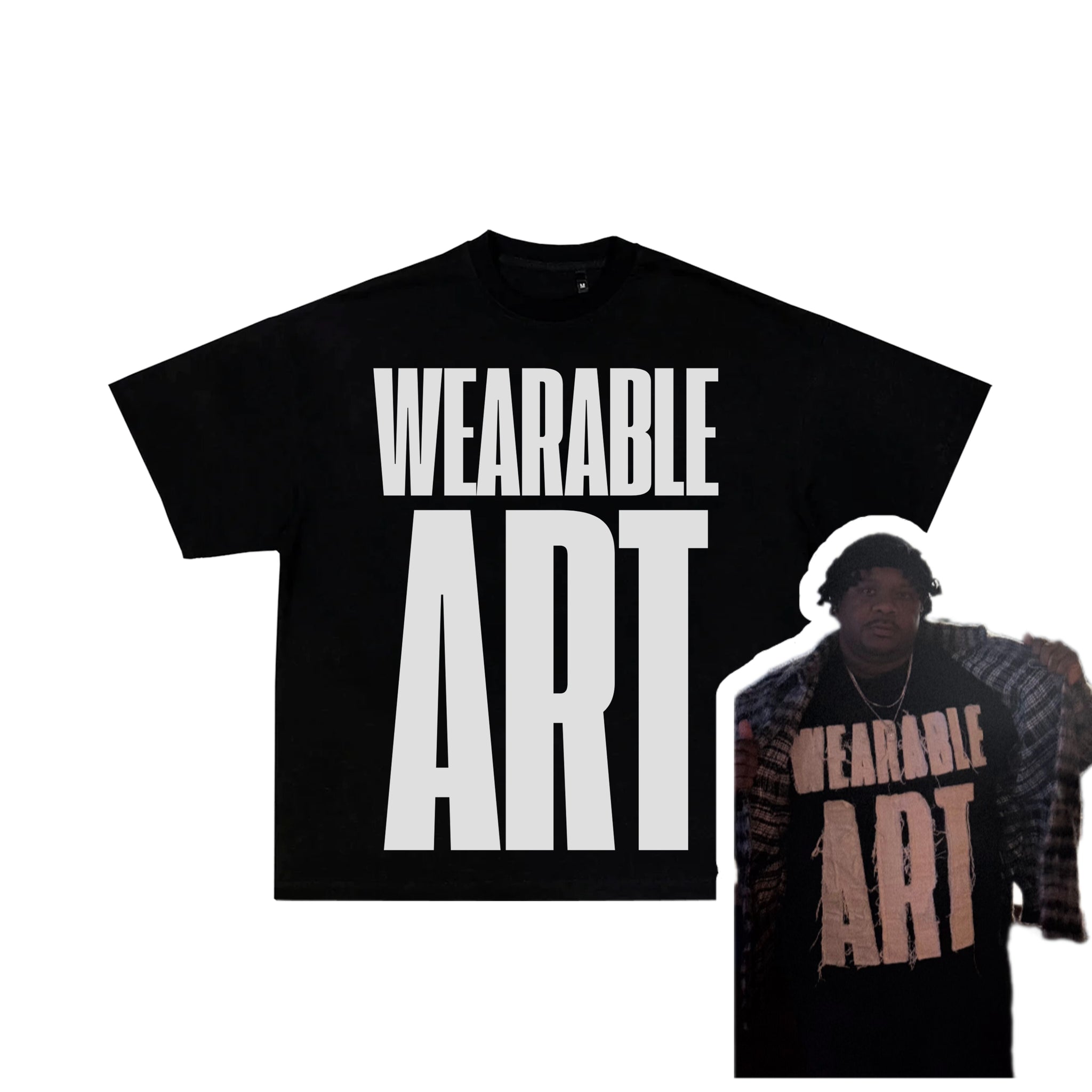 The Wearable Art Tee isn’t just a statement, its the canvas. Oversized block lettering stitched and distressed by hand, with raw edges and loose threads that tell a story. It’s imperfect on purpose. Just like real art.